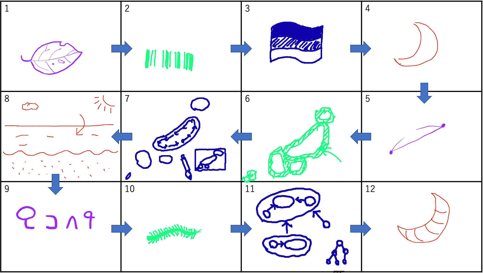 writer の 4 人 (japlj, kagamiz, snuke, tozangezan) で絵しりとりをしました。以下に示すのがその画像です。